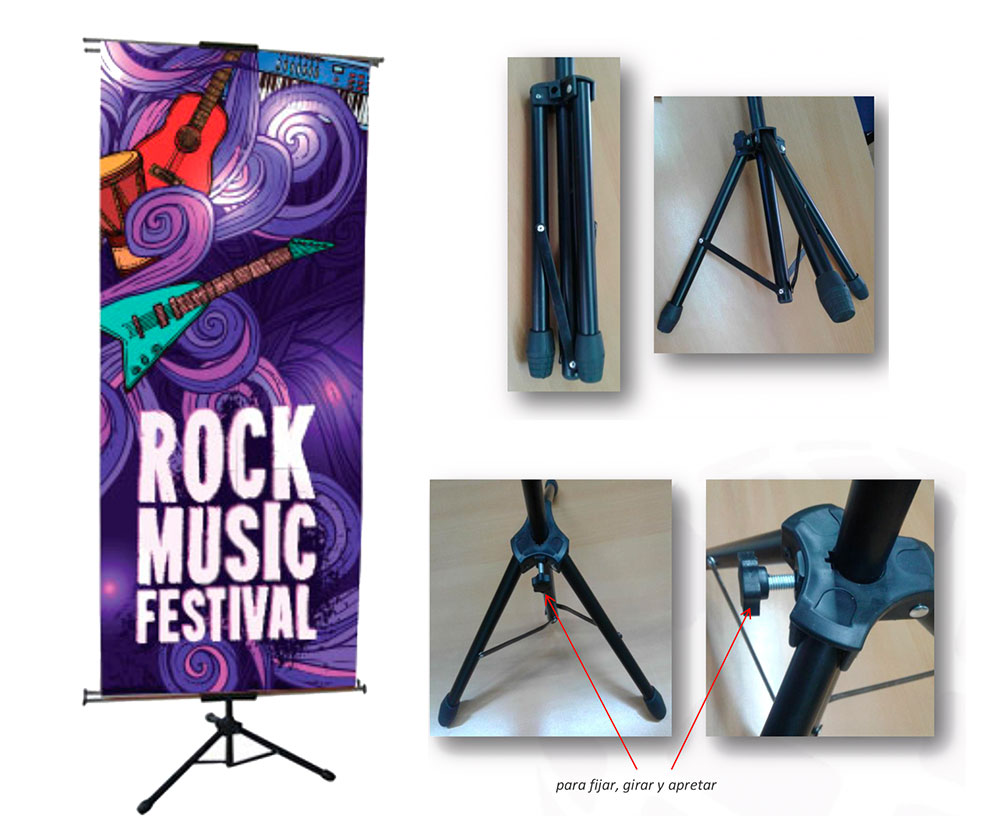 Este tipo de porta pendón trípode se trata de una base en forma de trípode, elaborada en hierro, desarmable y con estuche para transportar. Viene acompañada de su respectiva impresión digital de 200x100cm, en banner de 13 onz a full color y alta resolución.